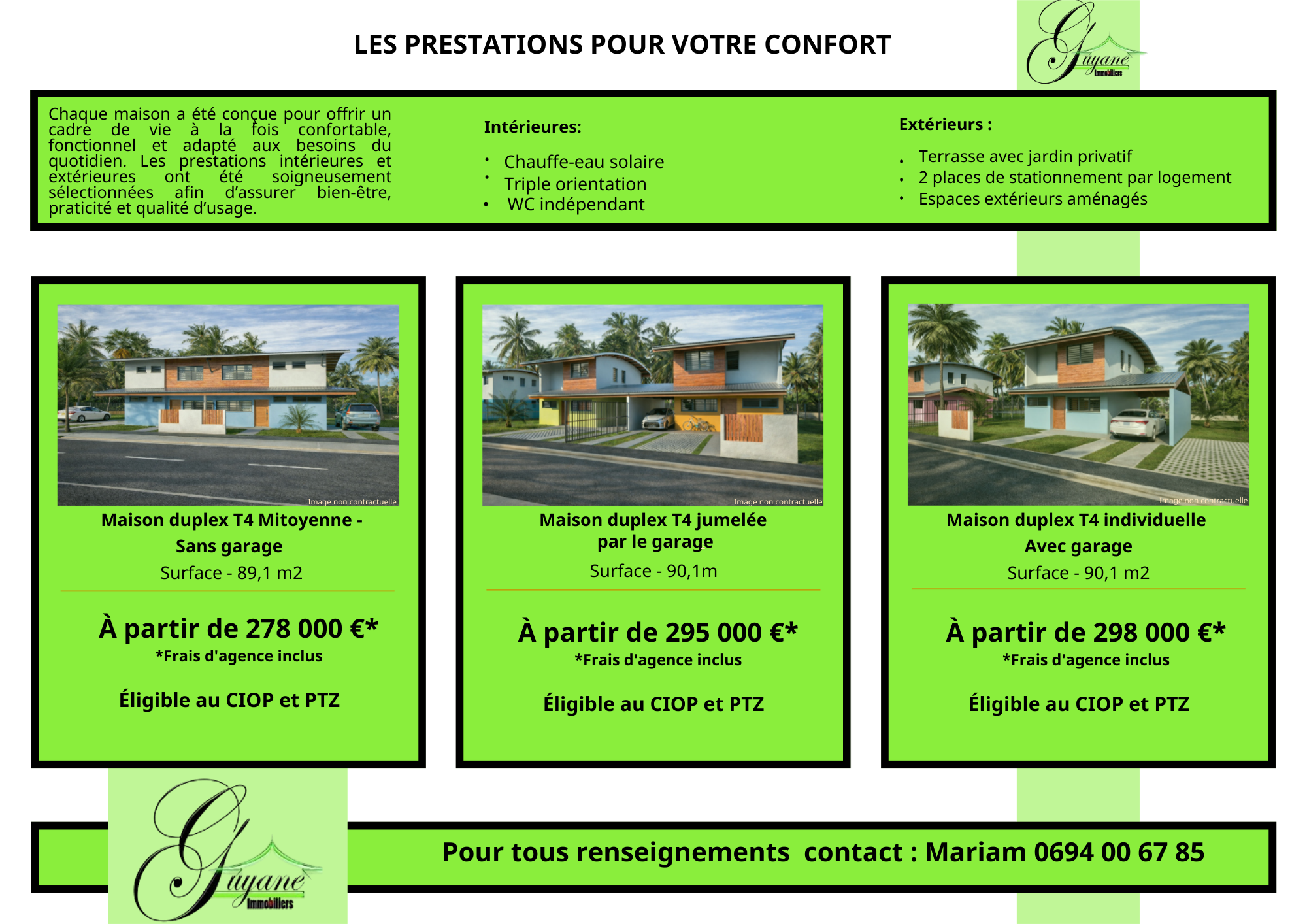 Ce programment vous offre une opportunité d’investissement ou de résidence principale dans un secteur en développement.Cette maison a été conçue pour offrir un cadre de vie à la fois confortable, fonctionnel et adapté aux besoins du quotidien. Il s'agit d'une maison mitoyenne par le garage comprenant au Au RDC un séjour spacieux et lumineux, une terrasse, une cuisine aménagée, une salle d'eau, un WC indépendant. A l'étage 3 chambres, une salle d'eau, un WC indépendant. Un garage Les prestations intérieures et extérieures ont été soigneusement sélectionnées afin d’assurer bien-être, praticité et qualité d’usage offrant un cadre de vie Idéal dans un environnement calme et agréable, tout en restant proches des commodités avec notamment une maternelle à 10 minutes à pied et un collège à 5 minutes en voiture ainsi que de nombreux loisirs (cinéma, restaurant,magasins) Contactez nous au 06 94 00 67 85 ou par mail sp.guyane973@gmail.com * IMAGE NON CONTRACTUELLE *